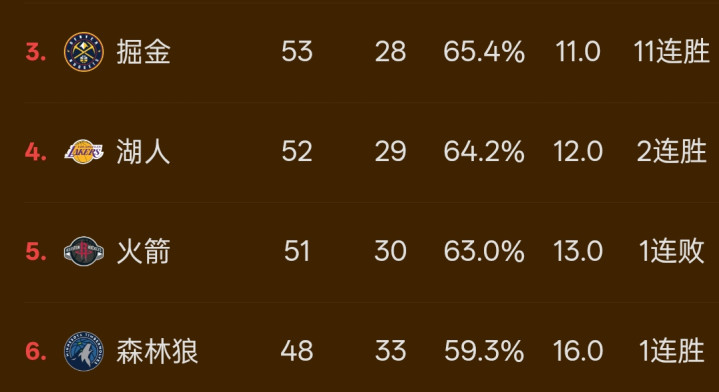 但湖人本赛季三杀掘金,有交手优势,所以湖人会"被迫"升到第三,掘金只能掉到第四。