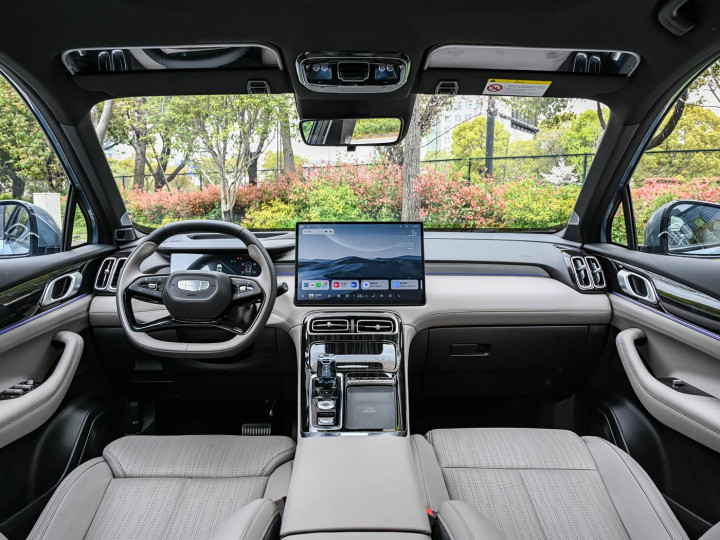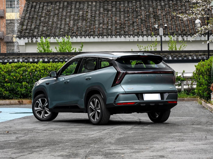 再来看车身侧面部分,修长的车身搭配流畅的腰线,从前翼子板延伸至车尾,营造出低趴动感的姿态。19英寸铝合金轮圈造型精致,进一步提升了整车的运动气质。新车新增的“晴山蓝”车色堪称点睛之笔。采用纳米级珠光颜料,历经23次调色试验,在阳光下呈现出“远观如晴空,近看似山峦”的渐变质感,灵感源自敦煌壁画中的青金石色,既彰显东方美学韵味,又满足了消费者对个性化的需求。车身尺寸方面,博越L小蓝灯版长宽高为4730mm×1910mm×1710mm,轴距达2785mm,在紧凑型SUV中优势明显。