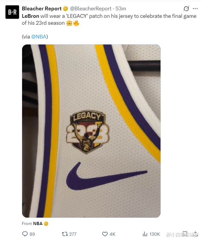 根据美媒BR的报道,这场比赛是勒布朗-詹姆斯第23个赛季常规赛的最后一场,所以他的球衣上有一个特别的徽章,上面印着“传奇”。