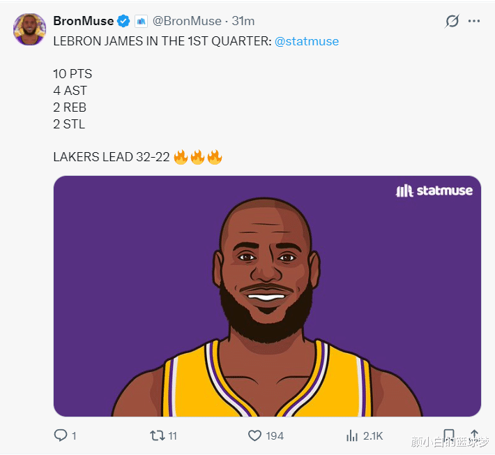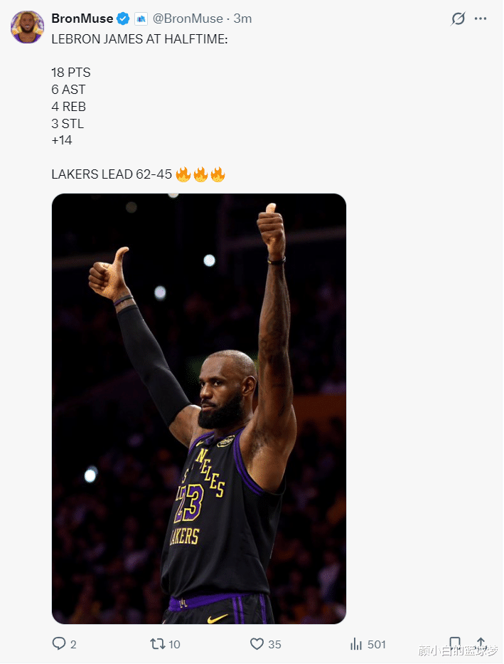 原本以为雷迪克会考虑在这场比赛轮休勒布朗,因为就算这场输了湖人也锁定西部第四,外界都觉得湖人首轮VS火箭更优。可雷迪克想要三连胜进入季后赛,甚至还想博一下西部第三。老詹开场火力全开7中3拿到10分2篮板4助攻2抢断。